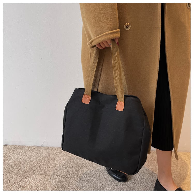 彼女は韓国ファッションの一部として、魅力溢れるキャンバス生地のトートバッグを見つけた。
