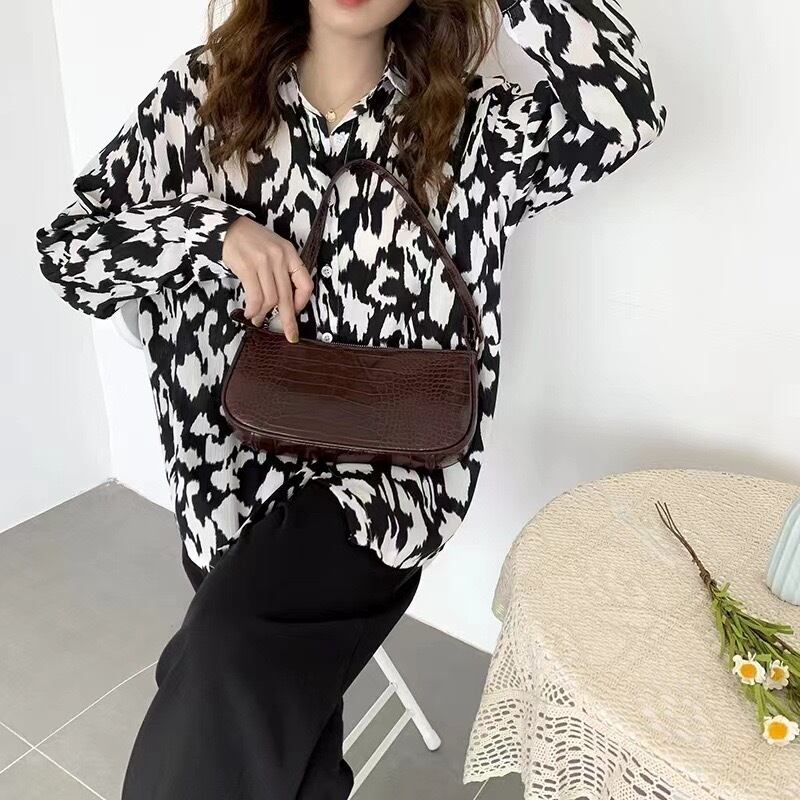 きれいめブラウス×テーパードパンツのスタイルに、ブラックのクロコ柄ショルダーを合わせれば、スタイリッシュで大人の余裕を感じさせる上品な印象に。