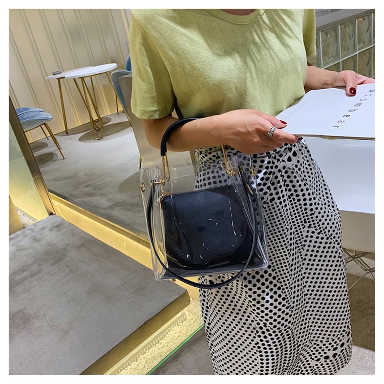 PVCショルダーバッグ ポーチ付き レディース 透明 トートバッグ おしゃれ プール 肩かけバッグ カバン 手さげバッグ 2wayバッグ ミニサイズ ショルダーバッグ 夏 かわいい 斜めがけ 大人 シンプル カジュアル ブラック 韓国ファッション 配送無料